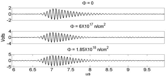 A-Scans obtained from AlN TRIGA reactor core, Φ is the fast neutron fluence [].