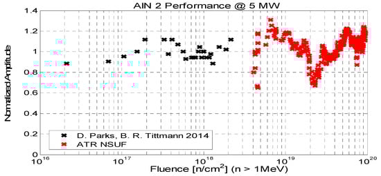 - Tittmann, B.R.; Reinhardt, B.; Parks, D.R. Nuclear Radiation Tolerance of Single Crystal Aluminum Nitride Ultrasonic Transducer. In Proceedings of the 2014 IEEE International Ultrasonics Symposium, Chicago, IL, USA, 3–6 September 2014. [Google Scholar] [CrossRef]