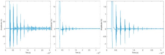 A-scan pulse-echo measurements of Bi4Ti3O12 (left), LiNbO3 (center), and organic Bi4Ti3O12 (right) thick-film transducers deposited on steel cylinder (7 mm) at 40 dB gain, film thickness ~200 micron, and frequency ~1.5 MHz [].
