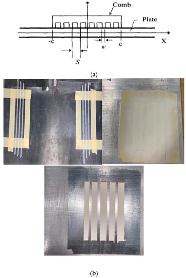To demonstrate their ability to perform as a guided-wave sensor, the primary Lamb wave modes (A0, S0, A1, S1) were generated using a comb transducer arrangement. Furthermore, 6061 aluminum plates of several different thicknesses ranging from 2 to 4 mm were chosen as the waveguides. Sets of comb transducers were then applied onto the plate a certain distance apart in a through-transmission setup as shown in Figure 16a,b.