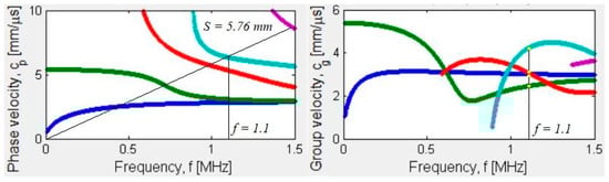 Dispersion curves for a 3.2 mm thick aluminum 6061 plate showing the activation line on the phase velocity and corresponding group velocities at that frequency [].
