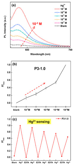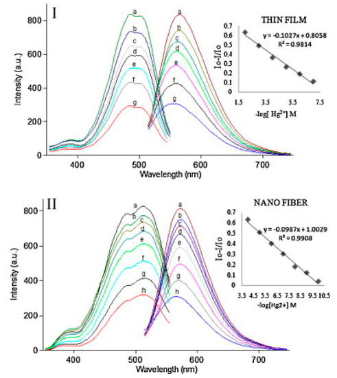 Figure 4 depict the corresponding sensing response. The photoluminescence (PL) spectra of the P3-1.0 electrospun nanofibers after treatment with various concentrations of Hg