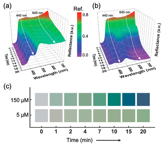 Figure 3a, the reflectance intensity of 440 nm gradually decreased over time, whereas the intensity at 645 nm was found to be relatively stable (>7 min) in the case of Hg