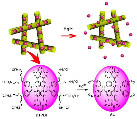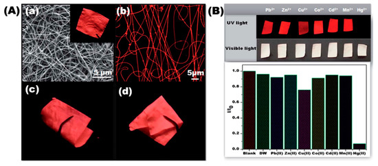 Another study reported the preparation of a highly sensitive and selective fluorescent nanofibrous membrane (FNFM) using polyacrylonitrile (PAN) nanofibers and subsequent surface immobilization of dithioacetal-modified perylenediimide (DTPDI) for the detection of mercuric ions (II) that possess excellent stability under mechanical force through electrostatic interaction [
