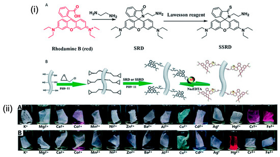 2+ ion sensing. For instance, Wei et al. prepared poly(vinyl alcohol) electrospun nanofibrous (PVANF) membranes modified with spirolactam–rhodamine derivatives (PVANF–SRD) and sulfo-spirolactam–rhodamine derivatives (PVANF–SSRD) that sensitively detect metal ions [
