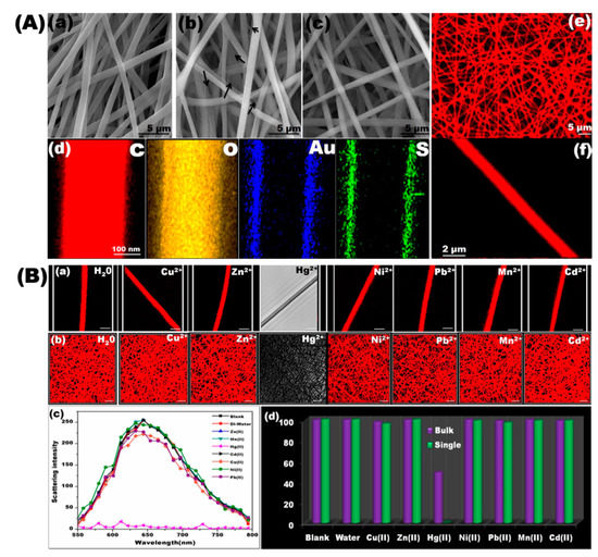 Figure 10A exemplifies the morphological, fluorescent, and elemental characteristics of the PCL-NF and gold nanocluster (AuNC)-coated PCL-NF termed AuNC*PCL-NF. The AuNC*PCL-NF possesses remarkable stability after more than four months in ambient conditions. The sensing experiments were carried out by dropping the desired concentration of metal ion solution on the nanofiber surface, and confocal laser scanning microscope (CLSM) images were taken after drying the nanofibers. In the real-time visual monitoring, the images were captured immediately following the metal ion solution passing, and corresponding spectra were recorded as a function of time. The sensing performance of AuNC*PCL-NF following exposure to various concentrations (50 ppt to 20 ppm) of Hg