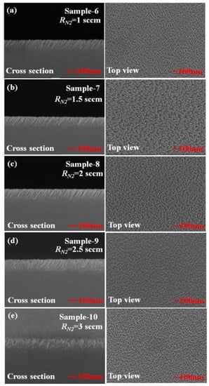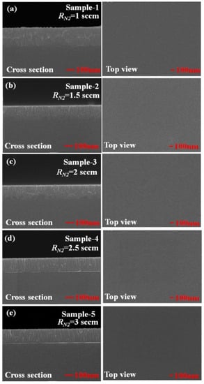 Top-view and cross-section scanning electron microscopic (SEM) images of the TiN uniform films deposited at (a) RN2 = 1 sccm, (b) RN2 = 1.5 sccm, (c) RN2 = 2 sccm, (d) RN2 = 2.5 sccm, and (e) RN2 = 3 sccm.