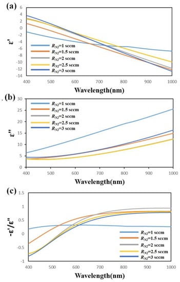 The optical property of TiN thin films was analyzed by variable angle spectroscopic ellipsometry (J.A. Woollam Co., VASE, Lincoln, NE, USA). The permittivity of the TiN thin films was obtained by fitting the spectroscopic elliptical parameters of the polarization state using the Drude−Lorentz model []. The permittivity ε = ε’ + ε” of each sample was measured as a function of wavelength, as shown in Figure 3a,b. The trend of real permittivity of the TiN thin films with RN2 = 1 sccm differed from that of other samples. The real part of the permittivity of Sample-1 is negative over the whole wavelengths from 400 to 1000 nm. For Sample-2 to Sample-5, the real permittivity as a function of wavelength indicates that the cross-zero wavelength λc increased from 482 to 613 nm as the flow rate of nitrogen increased from 1.5 to 3 sccm. The imaginary permittivity declined as the wavelength increased from 400 to 1000 nm for all TiN thin films. Figure 3c shows the figure of merit (FOM)—ε’/ε”, calculated from the real and imaginary parts of the permittivity for the TiN thin films with RN2 = 1 sccm, RN2 = 1.5 sccm, RN2 = 2 sccm, RN2 = 2.5 sccm, and RN2 = 3 sccm. The FOM is used to predict the plasmonic efficiency of plasmonic materials []. A higher FOM represents better plasmonic efficiency. The results reveal a maximum FOM of 0.3216 for the TiN thin film with RN2 = 1.5 sccm at the excitation wavelength of 532 nm.