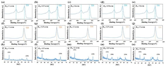 (a–e) Ti 2p and (f–j) N 1s photoemission core level spectra of TiN NRAs and (k–o) X-ray diffraction by TiN NRAs grown at RN2 = 1 sccm, RN2 = 1.5 sccm, RN2 = 2 sccm, RN2 = 2.5 sccm, and RN2 = 3 sccm.