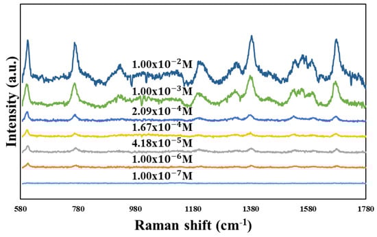 SERS spectra of R6G solution adsorbed on the TiN nanorod array for different concentrations from 10−2 to 10−7 M.