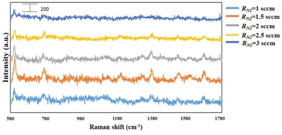 SERS spectra of TiN NRAs grown at RN2 = 1, 1.5, 2, 2.5, and 3 sccm.