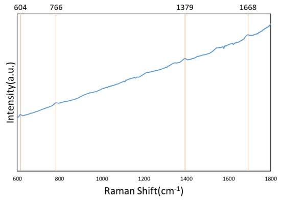 To perform the SERS characterization of the as-prepared TiN NRA substrates, R6G was used as a probe molecule. A 4 μL droplet of R6G methanol solution with a concentration of 10−6 M was dispersed on the surfaces of the TiN NRAs, which were then dried completely in air. After the droplet had evaporated, the area over which it had spread on each of the substrates was observed to be approximately 5 mm2. Raman spectra were obtained using a Stroker 785L Raman Spectrometer (Wasatch Photonics) with an excitation wavelength of 532 nm, power of 100 mW, a laser spot diameter of less than 50 μm, and a collection time of 30 ms. Before the saturated adsorption, the SERS signal would increase with increasing concentration of R6G molecules. Figure 6 shows the SERS intensity of Sample-7 measured at concentrations from 10−2 to 10−7 M. Figure 7 presents the SERS spectra of R6G solution that was adsorbed on Sample-6 to Sample-10. The Raman spectrum of R6G with a concentration of 10−1 M, absorbed on the bare Si surface was obtained as a reference, as shown in Figure 8. The characteristic Raman vibrational peaks of R6G can be well resolved at 604, 766, 1379, and 1668 cm−1. The Raman bands at 1688, 1379, 766, and 604 cm−1 are attributed to xanthene ring stretching, ethylamine group wagging, and carbon–oxygen stretching []. The noise spectra exhibit none of the spectral features associated with R6G. The signal-to-noise peaks at specific bands represent the characteristic of R6G []. The intensities of the Raman peaks of R6G for the TiN NRA deposited at RN2 = 1.5 sccm exceed those of other TiN NRAs. The characteristic Raman peak intensity of R6G at 604 cm−1 is greatest for the TiN NRAs. The variations of Raman peak intensities for samples deposited under the same condition are less than 10%. The SERS spectra of two samples (Sample-6 and Sample-6′) deposited at RN2 = 1.0 sccm are shown in Figure 9 to present the repetition in our experiment.