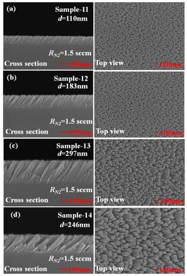 Top-view and cross-section scanning electron microscopic (SEM) images of TiN NRAs with thickness d = (a) 110 nm, (b) 183 nm, (c) 297 nm, and (d) 246 nm.