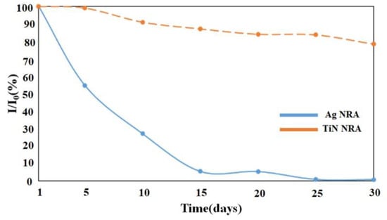 The stability of the TiN NRA was investigated. The SERS enhancement of the TiN NRA was measured and compared with those of a slanted Ag nanorod array (NRA) that had been previously developed as a highly sensitive SERS substrate []. The Ag NRA with a thickness of 217 nm was obliquely deposited by electron beam evaporation at a deposition angle of 88°. Figure 13 shows the variation of Raman peak intensity over time at 604 cm−1 for the Ag and TiN NRAs, respectively. After 15 days, the SERS enhancement of the Ag NRA was reduced to 6% relative to that of fresh Ag NRA after coating. The SERS enhancement of the TiN NRA remains above 90% for 10 days. After 30 days, the SERS enhancement of the TiN NRA is reduced by only 22%. The high stability of the Raman spectrum indicates the potential SERS application of the TiN NRAs.