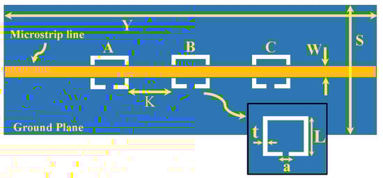 Electrically-small resonators such as complementary split-ring resonators (CSRRs) show higher sensitivity to detect the presence of the dielectric materials compared to split-ring resonators (SRRs) []. Figure 1 shows an MIS based on a two-port microstrip line exciting three-identical CSRRs (A, B, and C). Although the MIS is based on three-identical CSRRs, the concept can be generalized to any number of identical or non-identical resonators.