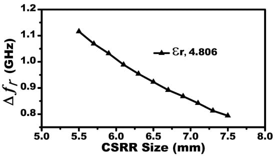 The sensitivity of a single CSRR (represented by a shift in the resonance frequency) as a function of the CSRR’s dimension when loaded with a dielectric slab having a relative permittivity of 4.8.