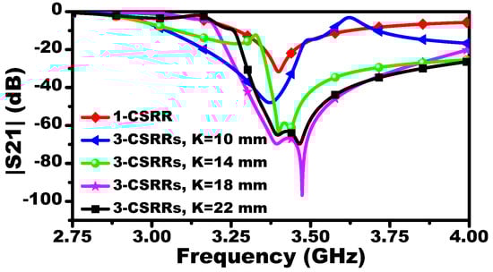 The scattering parameter of a single CSRR and three identical-coupled CSRRs with different values of K.