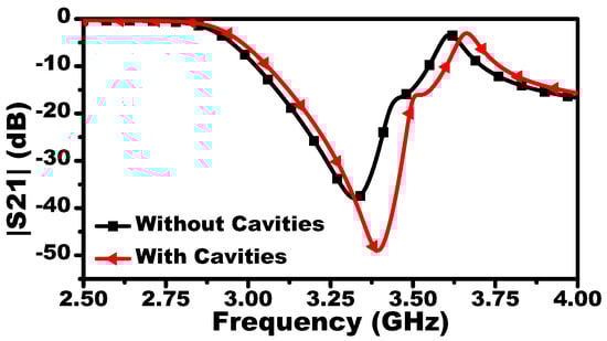 The MIS system will be tested by characterizing fluid concentrations. To this end, three-metallic cavities are added to contain the fluids. Figure 4 shows the frequency response of the MIS system with and without the metallic cavities. In fact, adding the cavities increased the sensitivity of the system as shown in Figure 5. This enhancement can be attributed to higher confinement of the electromagnetic field in the sensing area since the cavities are made of metallic material. The fluid concentration of a mixture material () is prepared by mixing two pure liquids: chloroform () and cyclohexane (), with permittivities of 4.806 and 2.015, respectively (taken from []).