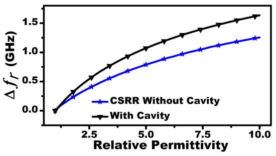 The sensitivity of a single CSRR (shift in the resonance frequency) versus relative permittivity of a dielectric slab with a thickness of 3 mm, with and without a cavity. The relative permittivity of a dielectric slab is varied from 1 to 10 with an increment of 0.2.