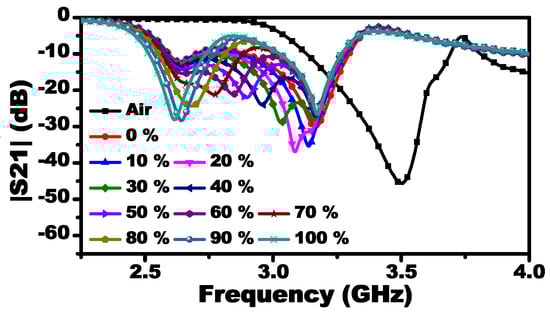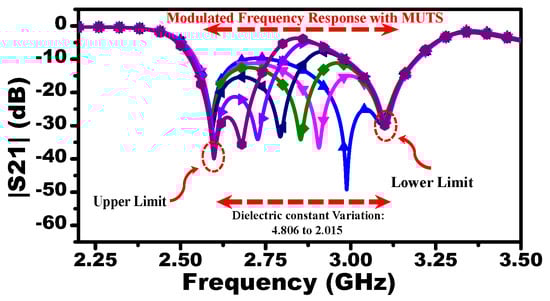 To study the effect of different liquid concentrations, the resonators A and C are loaded by dielectric materials with relative permittivity of 4.806 and 2.015, respectively, while resonator B is loaded by a dielectric material with its permittivity varying from 2.015 to 4.806 with an increment of 0.01. Thus, the response to pure cyclohexane and chloroform will determine the upper and lower frequency limits, whereas the response of the mixture will be presented as a notch in the located between the two frequency limits. For instance, Figure 6 shows the response of the MIS where the resonator B is loaded with a material with relative permittivity of 2.015. Since has the highest dielectric constant, the resonance frequency of the resonator A will exhibit the highest shift with respect to free space (upper limit), whereas the resonance frequency of the resonator C loaded with will exhibit the lowest shift (lower limit). Thus, the response of the system interacting with the mixture () will vary between the upper and lower resonance frequencies. With the dielectric variation of , the response of the system modulated with the reference materials () and () and the MUT () are extracted using the commercial three-dimensional full-wave simulation ANSYS HFSS [] as shown in Figure 7.