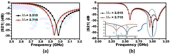 The response of the MIS system was analyzed and compared to a single CSRR based systems. Both systems were tested to detect materials with dielectric constants of 2.515 and 2.715. The responses of the single-CSRR and three-CSRR sensors are shown in Figure 8a,b, respectively. To quantify the sensitivity enhancement of the proposed MIS sensing platform, four parameters, namely, , , , and (see Figure 8b), were chosen to make the comparison between the two systems. , , , and represent the shifts in the resonance frequency, changes in the at the two resonance frequencies (at the notch of the of the two systems), changes in the at the first resonance frequency (the presence of with the value of 2.515), and changes in the at the second resonance frequency (the presence of with the value of 2.515), respectively. For , the sensitivity is enhanced by 7 MHz or equivalent to 16.5% when the shifts in the resonance frequencies (49.4 and 42.6 MHz) of the MIS system and the single CSRR based system, respectively, are compared. For , when compared to the single CSRR based system, the sensitivity enhancement in terms of changes in the of the MIS system when the resonance frequency exhibits a change from 3 to 2.95 GHz, is 14 dB or equivalent to 78.21%. For , the sensitivity enhancement that is evaluated at a single frequency (the resonance frequency of 3 GHz of the MIS system) based on the changes in is calculated as 21.24 dB or equivalent to 163.38%. Finally, shows a sensitivity enhancement of 6.38 dB or 46.73% at the resonance frequency of 2.95 GHz. This enhancement in the sensitivity indicates that the overall sensitivity of the proposed MIS system is enhanced over a wide range of frequencies. This enhancement of sensitivity is essential for increasing the accuracy of the entire detection system.