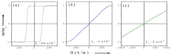 One of the examples illustrating the influence of the λs values and sign on hysteresis loops of magnetic microwires is shown in Figure 1.