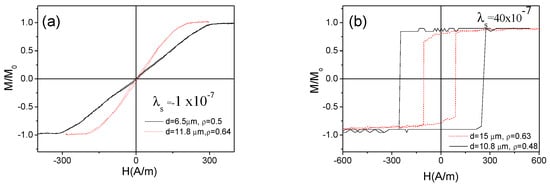 The common viewpoint on internal stresses distribution [,,] confirmed by a number of indirect experiments (chemical etching of glass-coating, measurements of microwires with different glass-coating thickness, effect of annealing on hysteresis loops) [,] is that the largest internal stresses within almost the whole metallic nucleus volume present the axial orientation. Furthermore, the internal stress values σi increase with increasing of the glass-coating thickness [,], i.e., linked with the ratio ρ between the metallic nucleus diameter d and the total microwire diameter, D (ρ = d/D) [,]. Consequently, microwires with even the same composition and hence the same λs values can present different magnetic properties. As an example, influence of the internal stresses controlled through the ρ–ratio for both families of microwires (Co-rich and Fe-rich) is shown in Figure 2.
