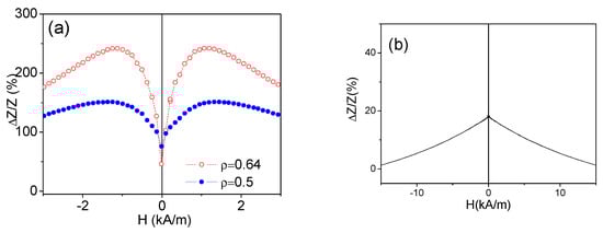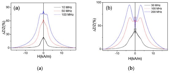 From Z-values obtained for different magnetic field H values we evaluated the magnetic field dependencies of the GMI ratio ΔZ/Z defined as described elsewhere [,,,]:
