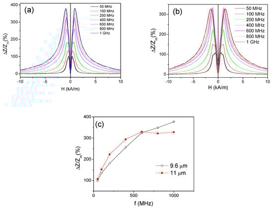 ΔZ/Z(H) dependencies measured at different frequencies in as-prepared Fe3.6Co71.3Ni0.2B13.4Si10.4C0.9Mo0.2 (d = 9.6 μm and 11 μm) microwires are shown in Figure 4a,b respectively. For comparison of the GMI effect in both samples we plotted frequency dependence of a maximum GMI ratio, ΔZ/Zm, defined as a maximum ΔZ/Z obtained at a given frequency. Both samples have high GMI ratio, however, for the frequency range below 600 MHz the microwire with d = 11 μm presents superior ΔZ/Zm values (Figure 4c). However, for f > 600 MHz the thinner sample (d = 9.6 μm) presents higher ΔZ/Zm values.