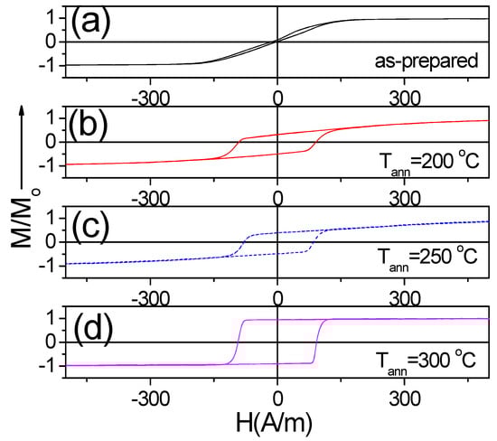 Hysteresis loops of as-prepared (a) and annealed at 200 °C (b), 250 °C (c) and 300 °C (d) Fe3.6Co69.2Ni1B12.5Si11Mo1.5C1 microwires.