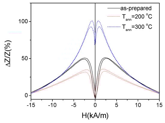 As discussed elsewhere [,,,,], the main parameter that affects the magnitude and the magnetic field dependence of the GMI effect (including off-diagonal components) of amorphous materials is the magnetic anisotropy. Consequently, tailoring the magnetoelastic anisotropy of amorphous microwires, either through the control of the internal stresses or the magnetostriction coefficient or induced magnetic anisotropy by specially designed post-processing are the main route to optimize the GMI effect in amorphous microwires [,,].