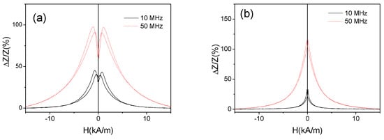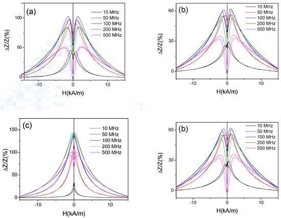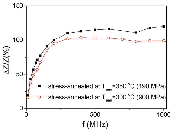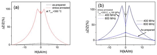 On the other hand, the shape of ΔZ/Z(H) dependencies measured at low f-values (10–100 MHz) is considerably affected by the annealing: a double-maximum dependence typical for wires with circumferential magnetic anisotropy is observed for as-prepared sample, while for annealed sample ΔZ/Z(H) dependence has a shape of decay from H = 0 (see Figure 8). However, increasing the frequency the double maximum ΔZ/Z(H) dependencies can be observed even in annealed samples (see Figure 7a–d).