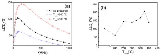 ΔZ/Zm(f) dependencies for as-prepared and annealed for 60 min at 200 °C and 300 °C Fe3.6Co69.2Ni1B12.5Si11Mo1.5C1.2 microwires (a) and ΔZ/Zm(Tann) dependence for Fe3.6Co69.2Ni1B12.5Si11Mo1.5C1.2 microwires measured at 100 MHz (b).