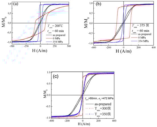 Hysteresis loops of Fe3.6Co69.2Ni1B12.5Si11Mo1.5C1.2 microwires as-prepared, annealed and stress-annealed at Tann = 200 °C (a) and Tann =375 °C (b) and at tann = 60 min, σa = 472 MPa for Tann = 300 °C and 350 °C (c).