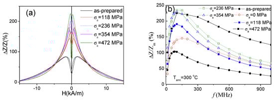 ΔZ/Z(H) dependences of as-prepared and stress-annealed at Tann = 300 °C samples at different σa measured at 200 MHz (a) and ΔZ/Zm(f) dependencies for the same samples (b).