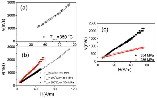 Experimental results on DW dynamics of studied sample are presented in Figure 12. Indeed, annealed sample presents quite fast DW propagation: for the sample annealed at Tann = 350 °C the DW velocity v up to 3000 m/s can be observed (Figure 12a). The DW dynamics is affected by Tann (Figure 12b) and σa (Figure 12c). One of the features of the DW dynamics in stress-annealed Fe3.6Co69.2Ni1B12.5Si11Mo1.5C1.2 microwires is that the magnetic field range at which the single DW propagation can be observed is shifted to low –field region (see Figure 12b) as compared to annealed (for σa = 0 MPa) samples.