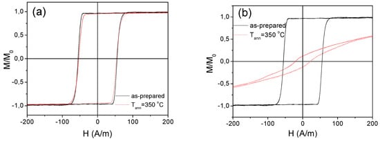 As can be seen from Figure 1b and Figure 2a, as-prepared Co-rich microwires present typical quasi-linear hysteresis loops with very low coercivity, Hc ≈ 5 A/m.