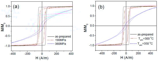 The influence of the annealing parameters (Tann, tann, σa) on hysteresis loop of Fe3.6Co69.2Ni1B12.5Si11Mo1.5C1.2 microwire subjected to stress-annealing is illustrated by Figure 10. From observed evolution of the hysteresis loop we can deduce that, as-compared to conventional annealing, stress-annealing allows coercivity, Hc, reduction and remanent magnetization, Mr/M0, increase (Figure 10a). However, observed changes are affected by annealing conditions, i.e., Tann, tann, σa. Thus, at high enough Tann or σa the rectangular hysteresis loop observed in stress-annealed Fe3.6Co69.2Ni1B12.5Si11Mo1.5C1.2 microwires becomes again linear, i.e., similar to those of as-prepared Co-rich microwires (see Figure 10c). On the other hand, the microwires annealed without stress present rectangular hysteresis loops for all Tann (see Figure 10b,c). Therefore, we can deduce that the conventional annealing (without stress) allows internal stresses relaxation. Consequently, observed increase of Hc and Mr/M0 upon annealing have been explained considering modification in the magnetostriction coefficient and growing of the inner single axially magnetized domain [,,]. However, for explanation of the influence of stress-annealing we can consider stress-annealing induced transverse magnetic anisotropy [,]. This stress-annealing induced transverse magnetic anisotropy becomes more relevant with increase of Tann, tann, σa [,]. Therefore, stress-annealed Fe3.6Co69.2Ni1B12.5Si11Mo1.5C1.2 microwires (annealed at high enough Tann, tann, σa) present lower Mr/M0-values [].