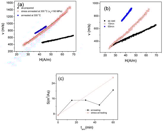 Furthermore, the DW dynamics in all annealed samples can be described by linear v(H) dependencies previously attributed to a viscous regime [,,,]: