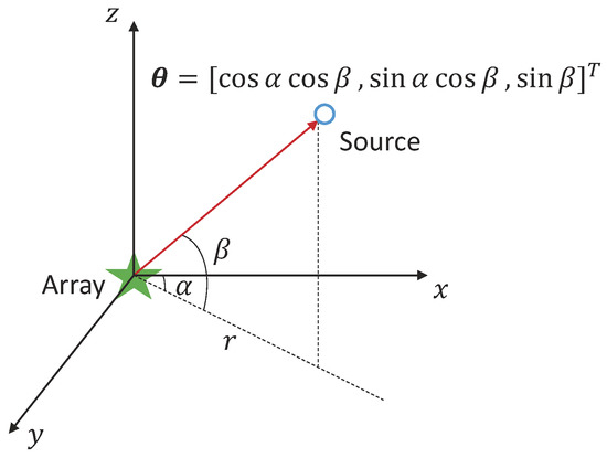 The geometrical relationship of the DOA () and the azimuth angle () and the grazing angle () is shown in Figure 1. For horizontal array, the grazing angle of propagation is small in the far-field scenario () [36], that is, . Therefore, the steering vector depends mainly on the azimuth angle . For simplicity, is approximated to in the following process.