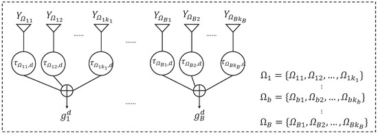 where denotes the dth time delay of the kth hydrophone corresponding to the first hydrophone at the bth subarray (the first hydrophone is chosen as the reference), and denote the distance and the unit directional vector between the kth hydrophone and the reference hydrophone, denotes the hydrophone index set of the bth subarray, c denotes the sound speed and denotes the imaginary unit. The enhanced signals of the dth source at frequency obtained by all subarrays are given by . The block diagram of subarray beamforming is shown in Figure 4.