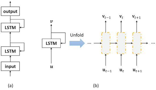 The configuration of LSTM-RNN. (a) The deep LSTM-RNN; (b) The configuration of LSTM memory blocks that unfolded across time.