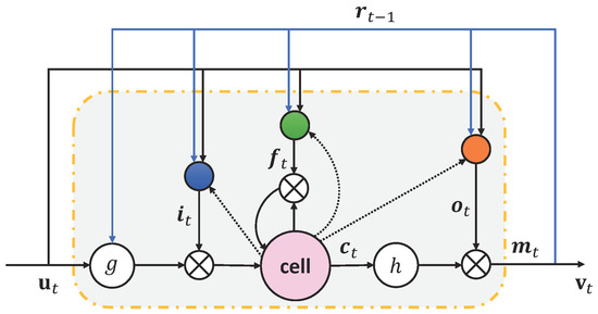 where , , , , denote the input gate, forget gate, output gate, cell activation, and cell output activation vectors respectively, terms denote the weight matrices, in which , , are diagonal weight matrices for peephole connections (the dotted lines from cell to gates in Figure 6), denotes the bias matrices, denotes the sigmoid activation function, ⊙ denotes the element-wise product, g and h are the cell input and cell output activation functions that are in this paper.