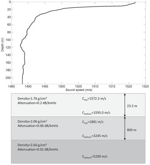 To investigate the performance of the proposed method, we simulated the relatively range independent SWellEx-96 Event S5 [45] environment. The sound speed profile (SSP) and geoacoustic parameters for SWellEx-96 Event S5 are shown in Figure 7. The seafloor is composed first of a m thick sediment layer with a density of g/cm and an attenuation of dB/kmHz. The top and bottom sound speeds are m/s and m/s. Below the sediment layer is an 800 m thick mudstone layer with a density of g/cm and an attenuation of dB/kmHz. The top and bottom sound speeds of the mudstone layer are 1881 m/s and 3245 m/s. The geoacoustic model is completed by a halfspace with a density of g/cm, an attenuation of dB/kmHz, and a compressional sound speed of 5200 m/s.