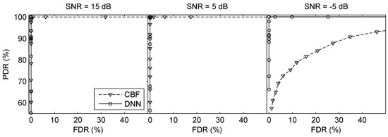 The first simulation was conducted to investigate the performance of the proposed method under different signal-to-noise ratios (SNRs). White noise was added to the simulated signals, resulting in SNRs of 15, 5, and dB. The SNR [49] reported here was defined as the SNR (at 210 Hz) at a single hydrophone when the source range was 1 km (SNR would decrease with source range increasing). Both source level (SL) and noise level (NL) were attenuated by dB/Oct. The CBF [34] was chosen as the competing algorithms in direction finding. Twenty snapshots were used to calculate beamformer power of CBF. For the sake of fairness, the posterior probability of FNN was averaged over every twenty frames. The results of the two-source scenarios and three-source scenarios on HCA are summarized in Table 2. The ROC curves of two-source scenario and three-source scenario are plotted in Figure 9 and Figure 10 (The SNR shown here is the SNR of the received signal for each source, and the SL of each source is assumed to be equal). It should be mentioned that, the number of points seen on the figures may be less than the number of points actually sampled, because (1) there are some correspond to the same PDR and FDR and they are overlapped in the figures; (2) there are some points of CBF go out of scope because of the large FDR when is small. From the ROC curves, although the performance degrades with the lower SNR, the FNN and CBF can detect sources effectively in general. Superficially, the three methods can give a high PDR with a low FDR by setting an appropriate threshold; however, the values of of CBF are larger than FNN significantly. The smaller implies the stronger ability of suppressing the interference. Thus, there are little phantom peaks of FNN than CBF, which is a good indication of its better capability of suppressing interference. When SNR decreases to dB, the FDR of CBF rises and PDR decreases, which reveals the proposed method is more robust than CBF under a lower SNR. Furthermore, the estimation errors of FNN are smaller than CBF in all conditions as shown in Table 2.