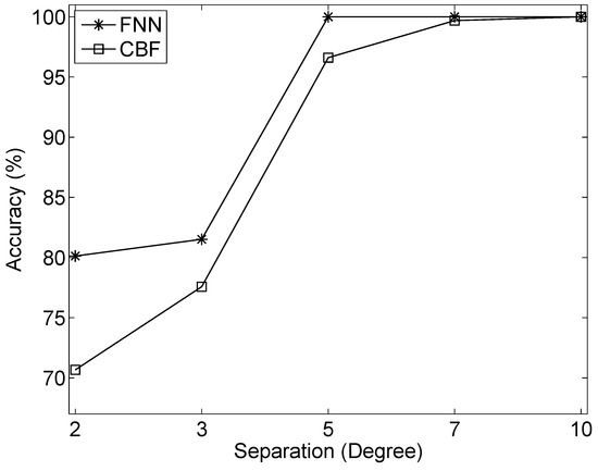 Detection accuracies of FNN and CBF. The detection is deemed to be correct only when the source number and the azimuths of two sources are estimated correctly. The accuracy is defined as the ratio of the number of accurate detections and the number of test samples.