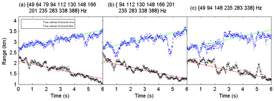 To apply DNNs to a multiple source localization task, generally, there are two ideas in previous studies. The first idea is to train a single neural network that detects the locations of multiple sources using the mixed signals emitted from various location combinations directly [24,25,26,27,28]. However, training a single network from mixtures to estimate the locations of multiple sources is not an easy task, the reasons of which include—(1) It is hard to traverse all the combinations of source locations with different azimuth angles and ranges (it is supposed that the source location is determined by azimuth angle and range). To get an idea of how much training is required, we consider the two-source scenario for example. We start with training the network with separation of azimuth angles from to (e.g., (), (),…, ()). Next we repeat the same procedure with to separations. Assuming the azimuth angle is integer, the combinations of azimuth angle are for two-source scenario. Then we also take the range combinations into consideration, the possible training combinations will be enormous because of the exhaustive training; (2) if we do not separate the mixed signal in advance, the feature for learning is highly correlated with the source combination. Thus the estimation would fail if the test sources’ location combination is mismatched with the training set, and the application will be limited. For example, in the two-source scenario with test source one at [, km] and test source two at [, km], if this combination does not exist in the training set, the single network (trained for two-source scenario) may fail to give an accurate estimation. Therefore, training the network suitable for various scenarios by mixtures directly is not an optimal scheme.