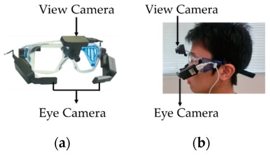 A driver’s gaze can also be estimated from their head movement. Gaze estimation has been performed by tracking the features of the driver’s head using a monocular camera attached to the steering column []. Although there are some studies [,,,,] that estimated the gaze direction via head movement, the problem with this method is that the accuracy is not high enough to be reliable for driving ability evaluation. In order to improve the gaze measurement accuracy, there has been research on gaze estimation using the movement of both the head and the eyes—a system that can be used while driving a car [,]. This research has utilized an “omnicam (3D panoramic camera)” and a “noninvasive stereo camera” [,]. Although these two methods can be used anywhere, they require recognition of the head and eyes via image processing, and the recognition rate is not enough.