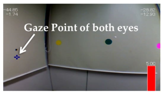 In the case of car driving evaluation, it is necessary to determine whether the driver is looking at a pedestrian or a traffic light. However, in previous research [,,,,,,,,,], it was not possible to know whether the driver is aware of the information on the road (e.g., pedestrians, traffic lights, road signs). Our proposed method can finally determine what specifically the driver is looking at using the image from the view camera. Therefore, our system is a usable method for calculating the gaze range while driving.