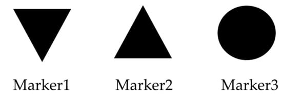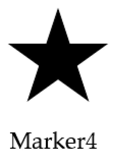 First, we described the positional relationship of the markers used for narrowing the search range. The markers are searched in the following order: the upward triangle marker (Marker1), then the circle marker (Marker2), then the downward triangle marker (Marker3), and finally the star shape marker (Marker4). For each marker, the search range was decided using the positional relation between previously searched-for markers as applicable. The search range of each marker was determined by the positional relationships between the markers, as follows: